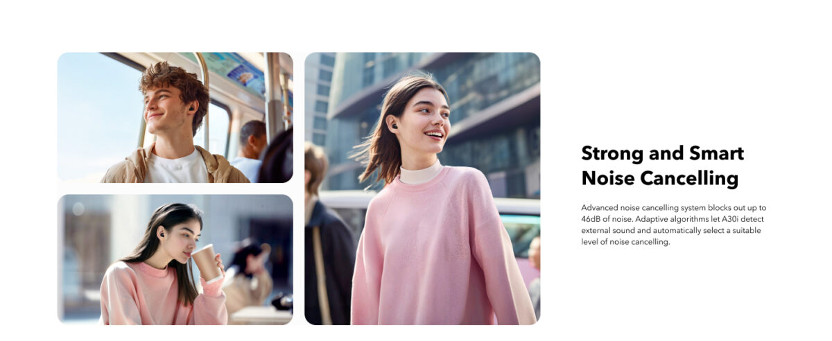 The Soundcore A30i noise-cancelling earbuds are capable of blocking out noise up to 46dB. Using adaptive algorithms, the A30i detects external sounds and automatically adjusts to a suitable level of noise cancellation. This smart noise-cancelling feature ensures that you can enjoy your music or calls without distractions, providing a perfect listening experience tailored to your environment.