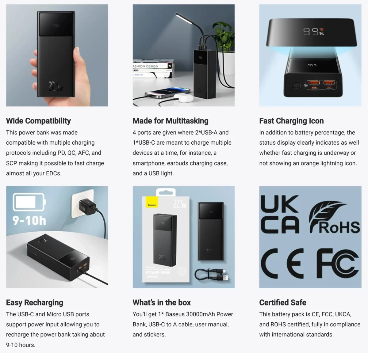 You’ll get 1* Baseus 30000mAh Power Bank, USB-C to A cable, user manual, and stickers.