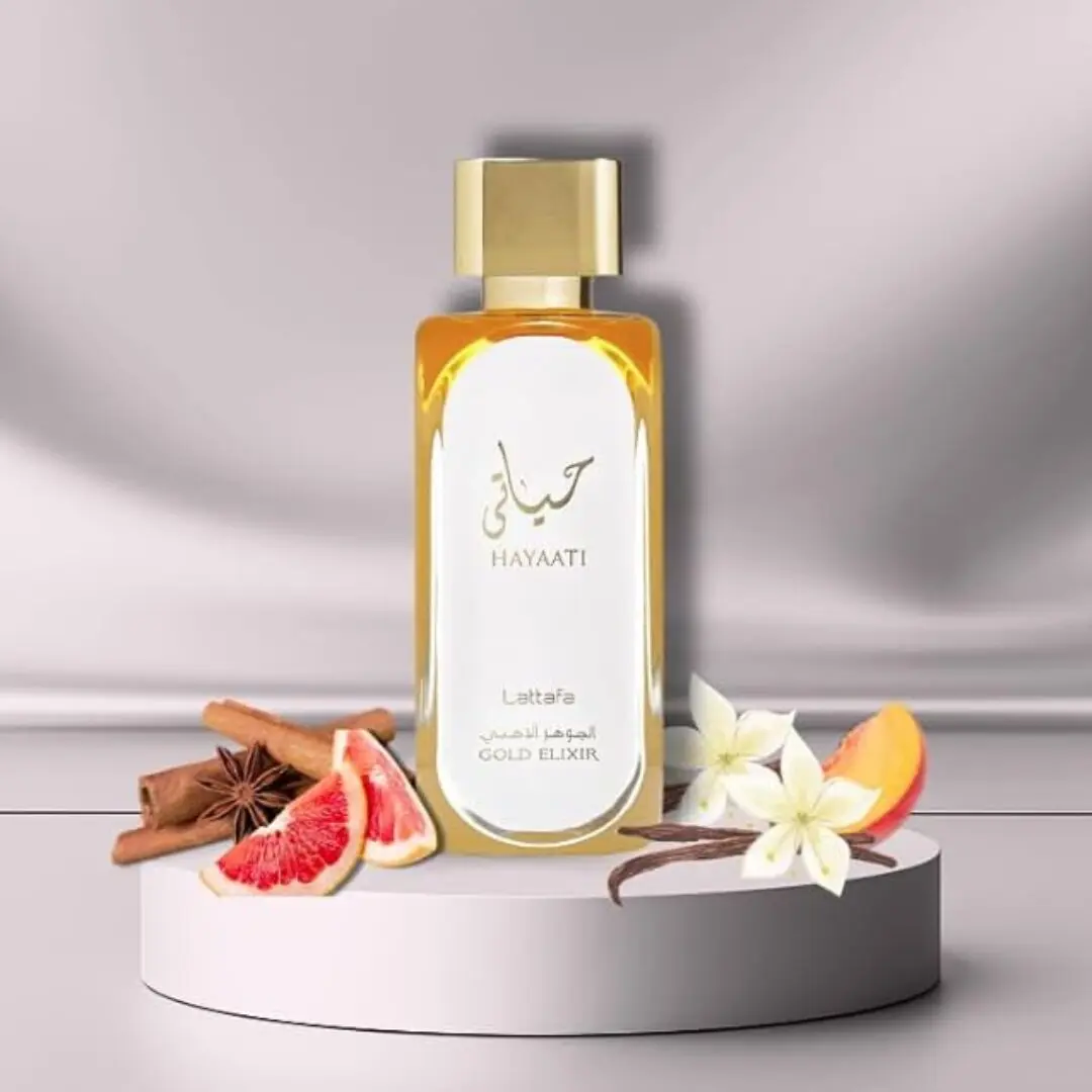 A radiant blend crafted for both men and women, Hayaati Gold Elixir opens with π bergamot, grapefruit & cassis, unveiling a heart of πΉ leather, peach & saffron, and settling into a warm base of πΏ vanilla, amber, musk & vetiver.